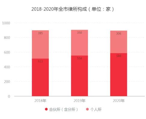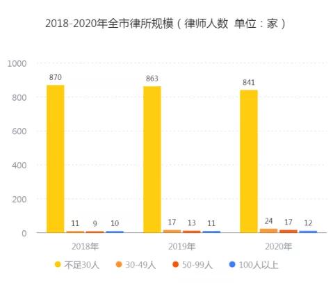 2020年末,全市律所100人以上的12家(其中200人以上的5家)、50-99人的17家、30-49人的24家、30人以下的841家。2018-2020年,全市律所呈现小微所逐年减少、大中型所逐年增加、分所逐年增多的可喜变化,表明律所做大做强的动能在不断增强,规模在不断扩大,结构在不断改善。这既是律所因应法律服务市场竞争发展的应然选择,也是行政管理部门和律师协会推进实施“2345”发展战略,加强律所规范化、规模化、专业化、跨域化发展引导指导,特别是对个人所的规范引导的体现。