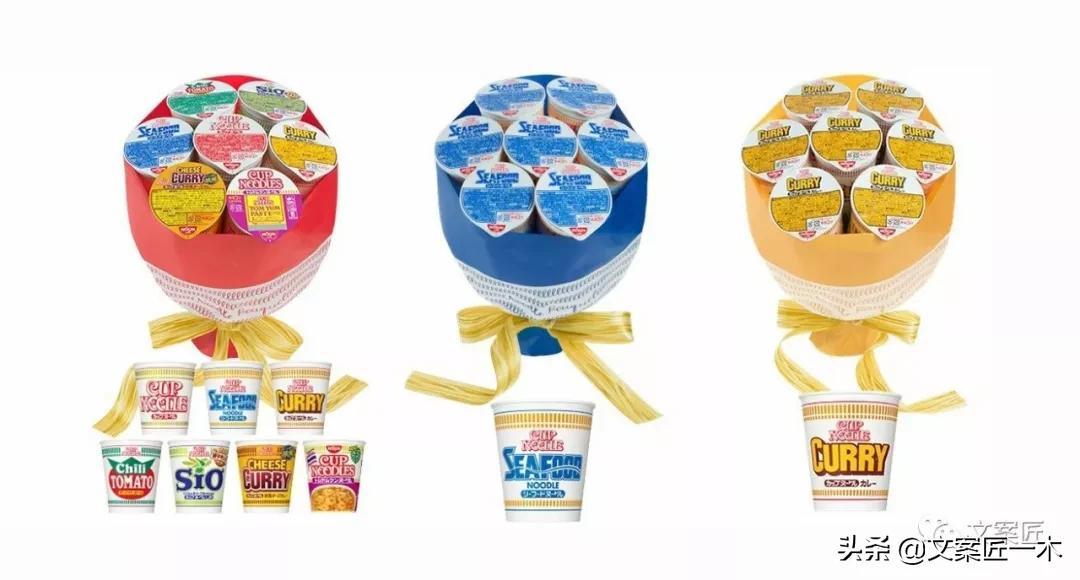 没错,真正的泡面花束!日清还为这款泡面花束依照口味不同准备了不同的包装,让你买“花”也有多种选择。