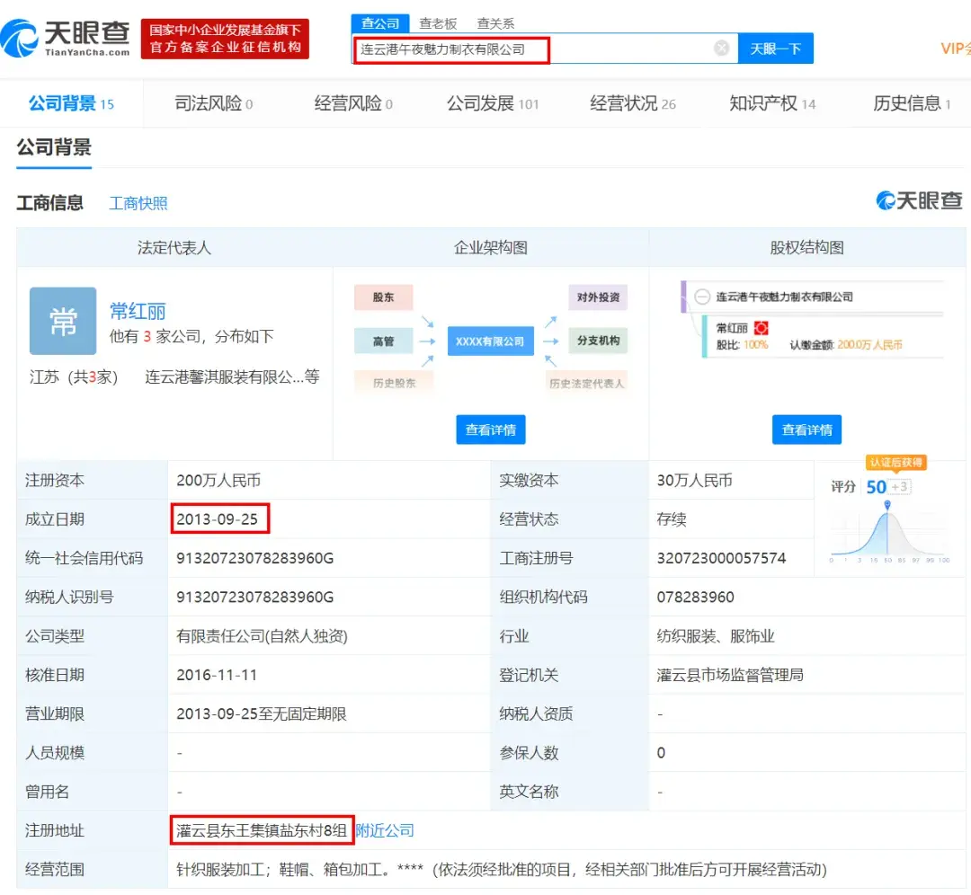 天眼查信息显示,连云港午夜魅力制衣有限公司成立于2013年,注册地址正是在灌云县。