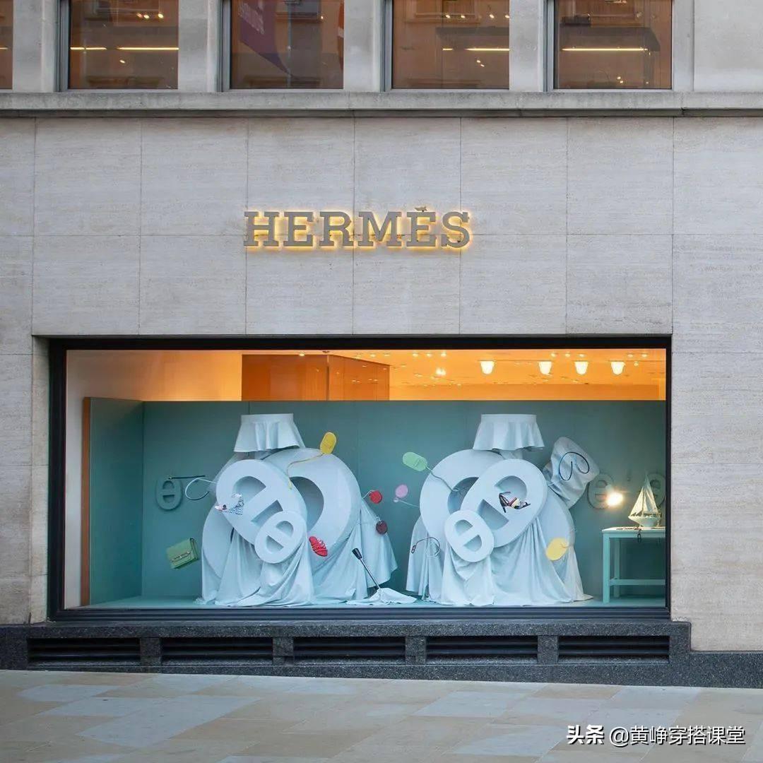 爱马仕的橱窗每年都会为产品系列定主题,定制专门的橱窗道具,比如上图的橱窗中,应用了经典的包包扣与白色布料作为装饰,同时悬挂一些当季主推款。
