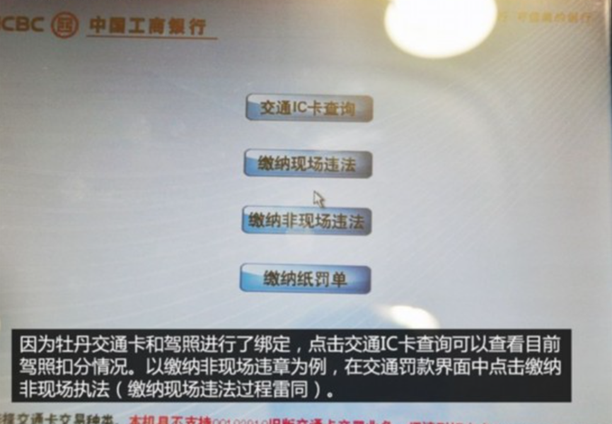 可携带驾驶证、行驶证、身份证以及驾驶证持有人开户的工行牡丹交通卡到临近的执法站打印处罚决定书,扣分,在自助终端完成缴费;当然目前也支持微信支付宝进行缴费了。流程如下所示。