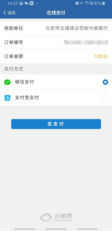 7. 选择你方便用的支付方式,支持微信和支付宝,如下图所示,至此你的一个违章就处理完了。