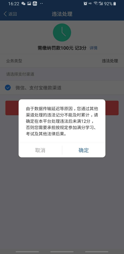 1.通过“交管12123”APP“违法处理”或“罚款缴纳”功能处理缴款后,不要通过其它渠道处理并缴纳罚款,避免重复缴罚。