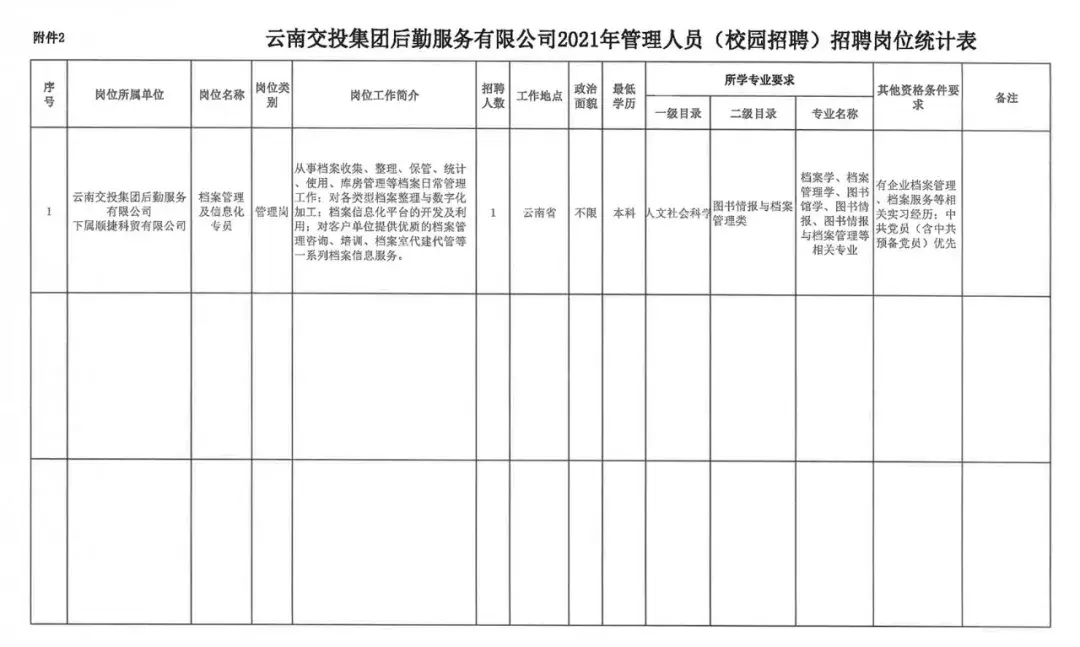 报名方式:采取网络报名方式,应聘者将报名材料压缩文件(命名为“报考岗位+姓名”,例如“****岗位李***”),统一发送至邮箱:云南业图人力资源服务有限公司工作人员邮箱:yetuhr@163.com。每人限报1个岗位。