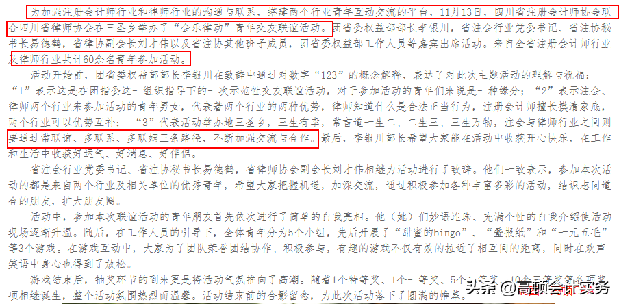 特别是领导致辞时表示:注会、律师两个行业来参加活动的青年男女,代表着两个行业的两种优势,律师知道什么是合法正当行为,注册会计师擅长摸清家底,两个行业可以优势互补。