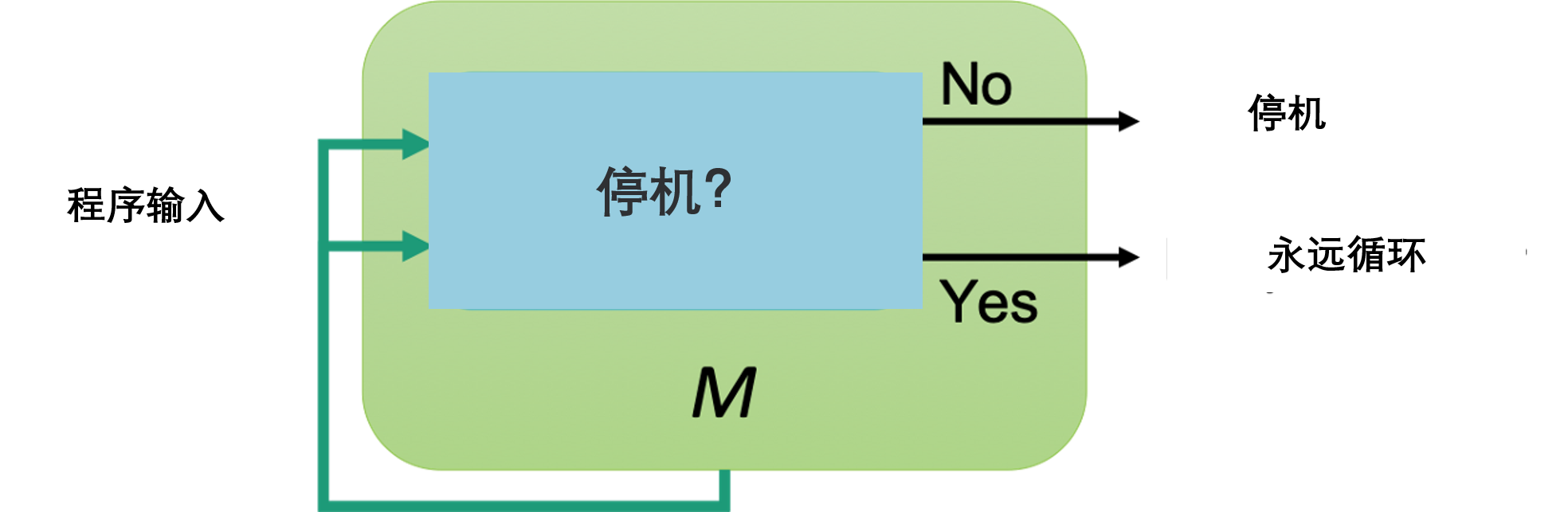如果M在M上停止,根据M的定义,M将永远循环——矛盾如果M在M上永远循环,M将停止——另一个矛盾这个自我参照悖论如下所示: