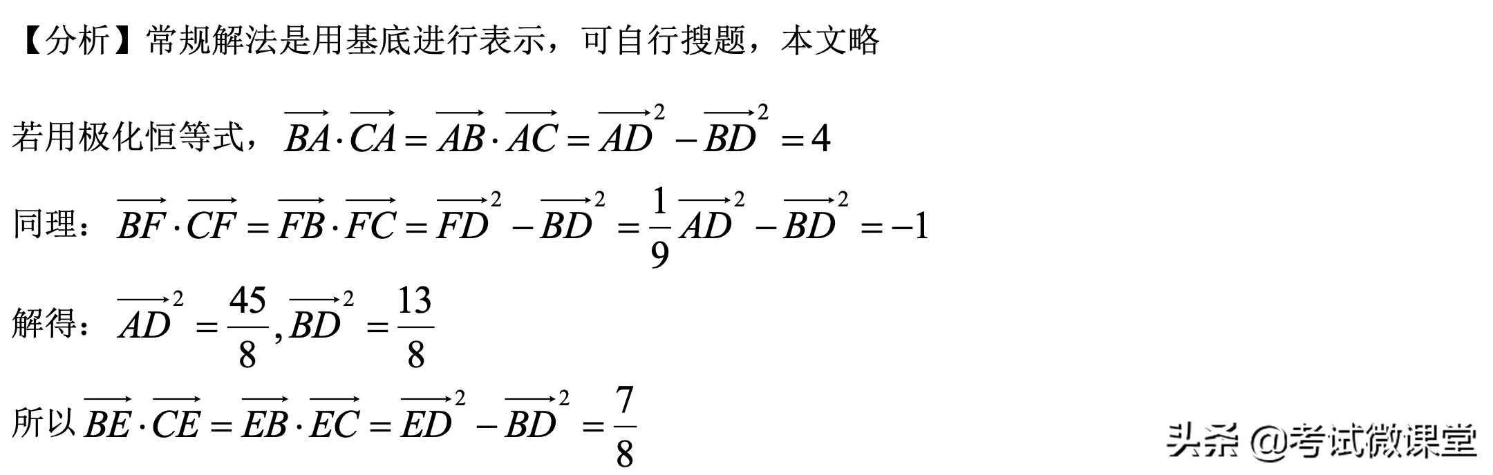 【点评】利用极化恒等式构造方程组,从而求出数量积的值。对于从中线与底边这两个方向寻找基底向量的数量积问题,可以运用极化恒等式,把数量积转化为数量的运算,大大简化计算量!
