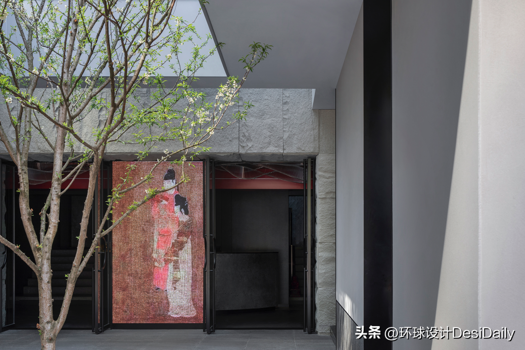 现代建筑体内,从屋檐,到庭院,从拴马桩到砖石,从花树到园林造景,到动态的文化碎片,表现手法不拘一格,借用东方元素的表达,将人们的神魂渐渐引入古代唐风宋画的东方意境之中。