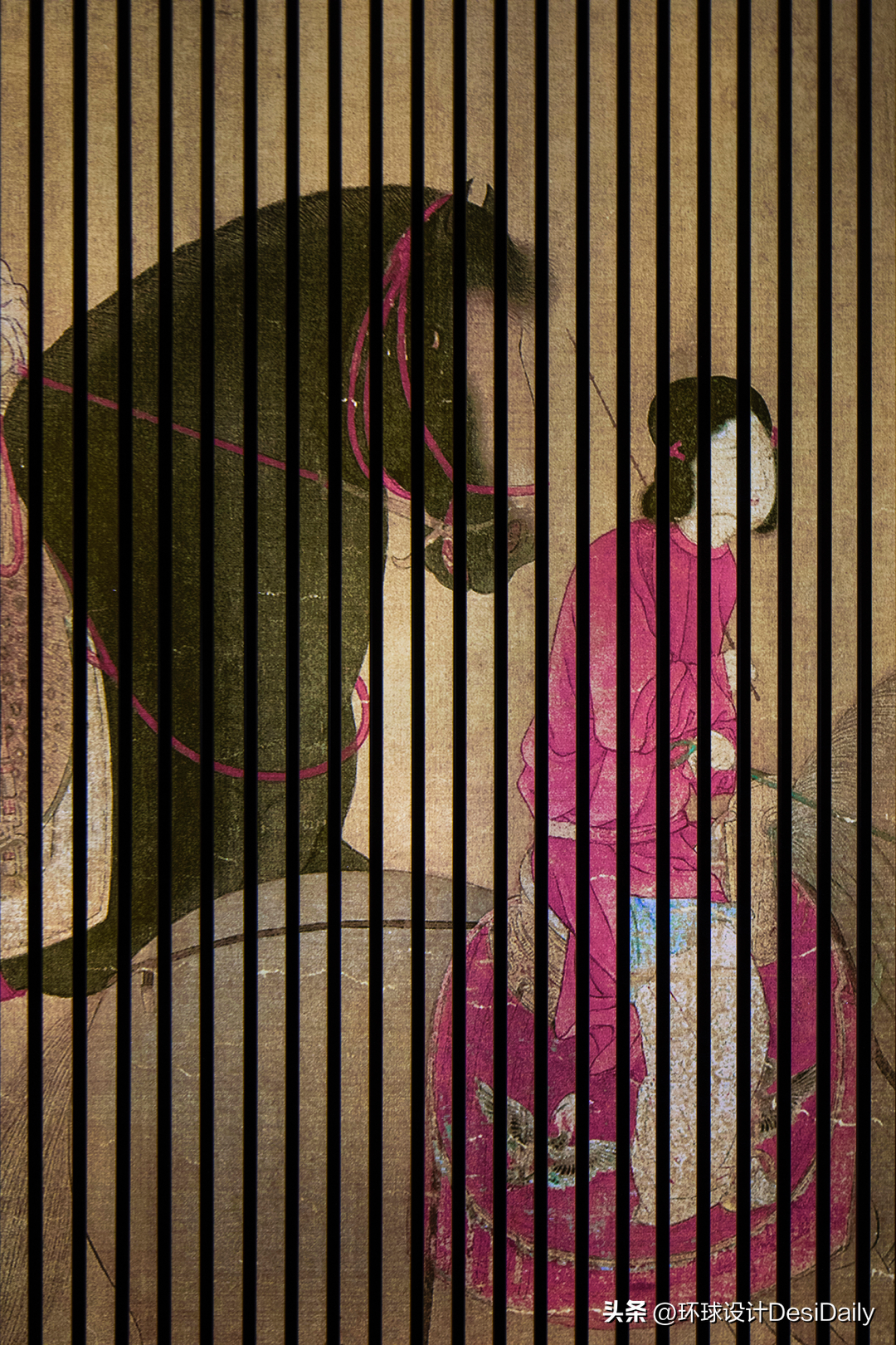 选用新型软木皮材质为画布,大厅、包房、走廊,空间化作长轴画卷,为画布质感与怀旧体现,故事、时间与文化在画卷中徐徐展开,《虢国夫人游春图》、《高逸图》、《韩熙载夜宴图》、《调琴啜茗图》、《牧马图》……有如“散点透视”,多重的空间叙事在此情境中叠合交融,不同的场景,不容的内容,空间视觉不再扁平,虚实穿插,连续的多维的迭代在建筑层面呈现,表达今与古的时空对话。