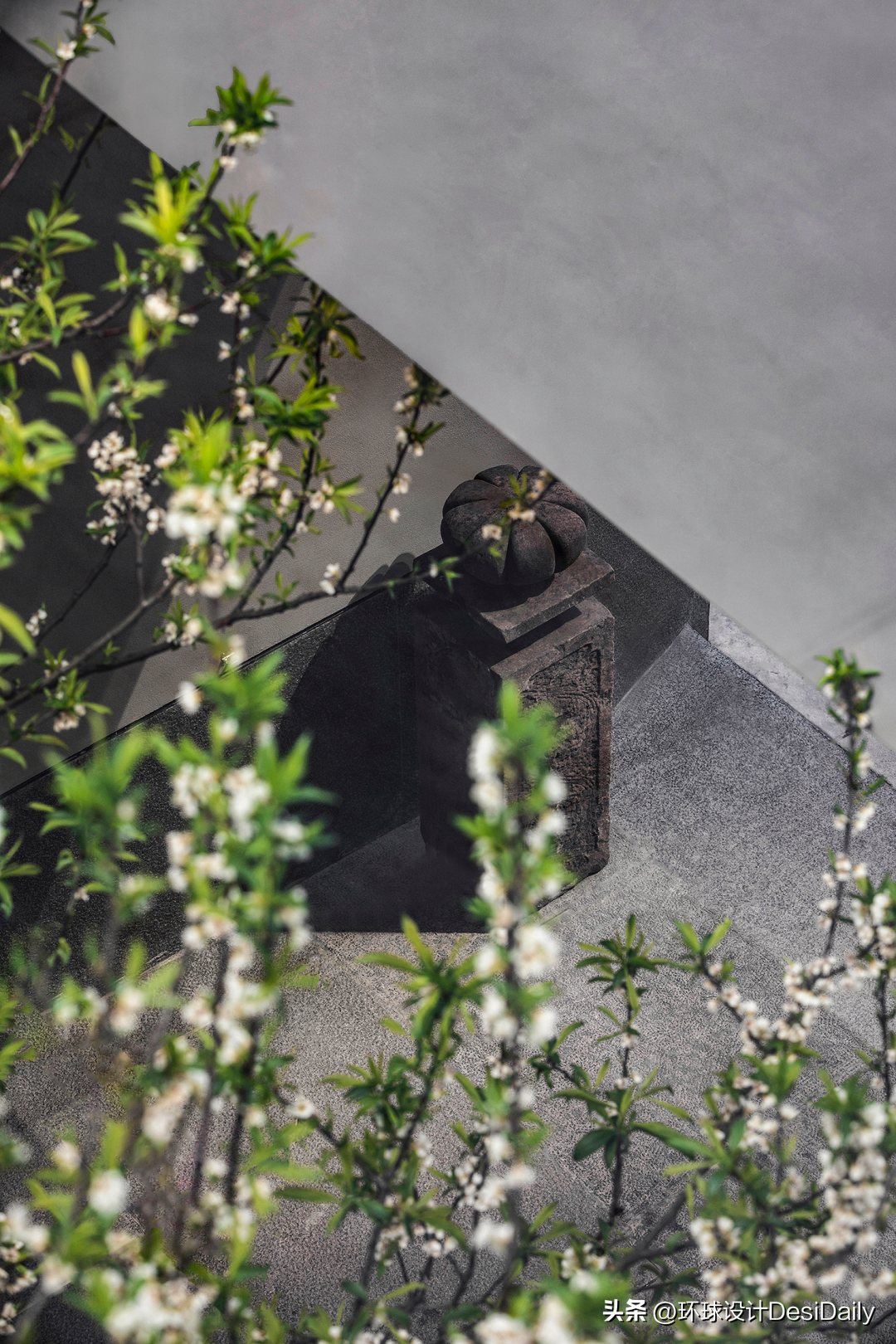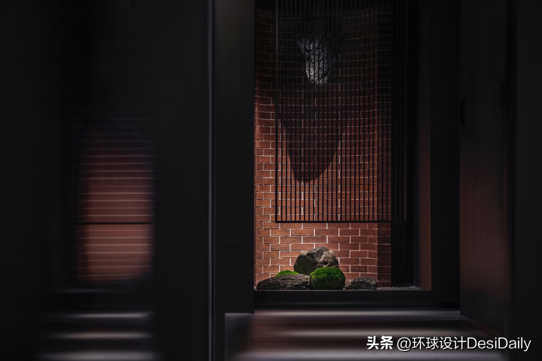 二层端头以片石、青苔做微观园林造景,顶有镜面,光影漫漫,意境无限。在过道区墙面拐角处,设计师将传统石柱做符号化处理,龛嵌于阳角中,以现代手法传递传统意境。