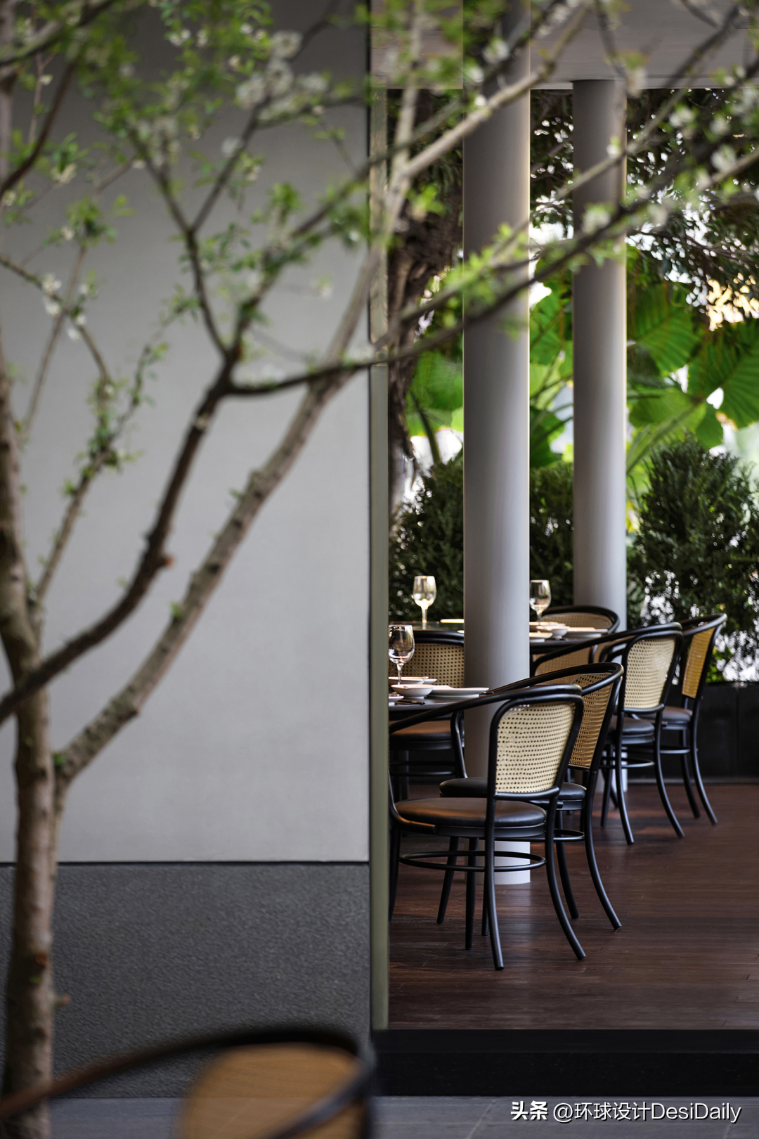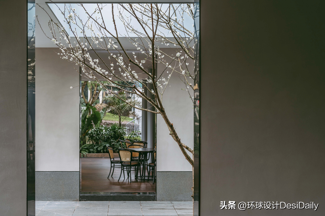 四面通透,植物围合成庭院,内外两个世界并行,外部景观在植物的掩映下时隐时现,有如唐影宋画,一瓢如江海,一树代山川,在此会友用餐,有游园之感。