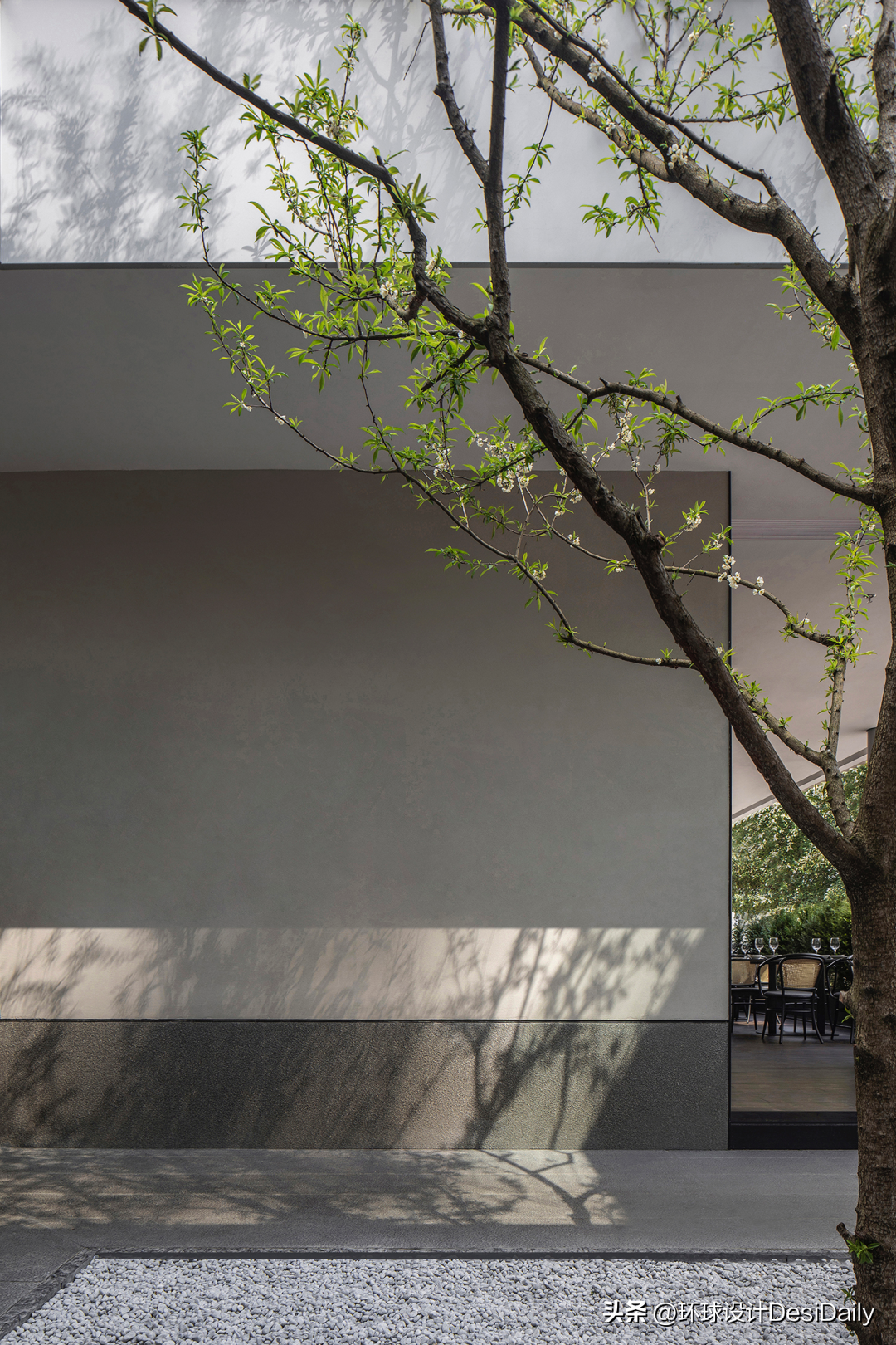 入户庭院是餐厅的主入口,在这里创造一片天地与场域。檐下造园,空间之中截来一段玲珑自由的苏式园林。亭亭一棵树为中轴线,视野向两端延伸,一脚踏进自然意境的涟漪。
