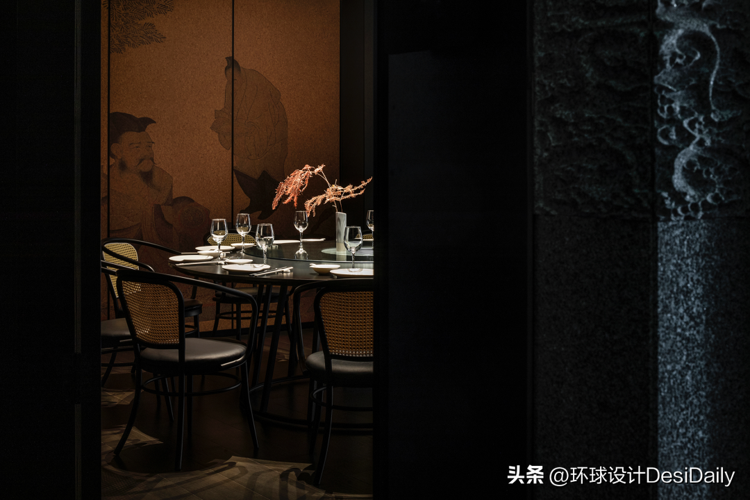 疫情改变用餐方式,整个空间之中,设计师去掉传统卡座大厅,改为包厢,环境、景观和谐共生。不仅将眼光放在空间设计上,更将目光投向整个建筑语言的表达,建筑内外空间的措置、光线的明暗、外观与色彩,纹样与景观,都有其意蕴与形式。这是一个既有传统中式文化符号,受到年长之人欢迎的环境,也是一个充满个人风格写意,凝结时空张弛,迎合年轻人喜好的空间。