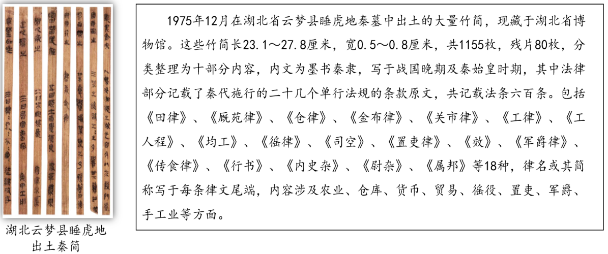 秦以法家思想治国,推动了律的编纂。此后历朝法典多以“律”命名。云梦睡虎地秦简的出土,丰富了人们对秦律的认识。