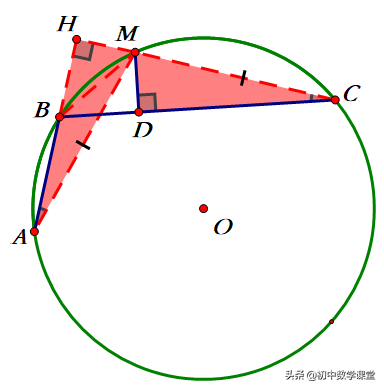 如右图所示,AB和BC是⊙O的两条弦(即ABC是圆的一条折弦),BC>AB,M是弧ABC的中点,则从M向BC所作垂线之垂足D是折弦ABC的中点,即CD=AB+BD。