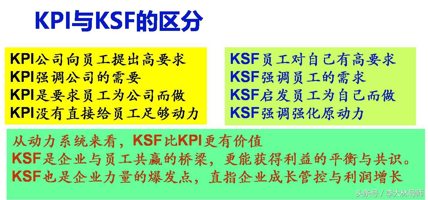 1、将企业目标转化为员工目标2、将企业要员工做到转化为员工自己要做到3、将笼统的职责转化为清晰的价值4、将对立的利益冲突转化为协作的做大共赢5、将管理层或团队的责任转化为所有员工的共同责任6、将员工为企业或他人而做转化为员工首先为自己而做由于KSF的主要价值更多地体现在与薪酬融合,所以更多的资料在下一章(薪酬与激励)。