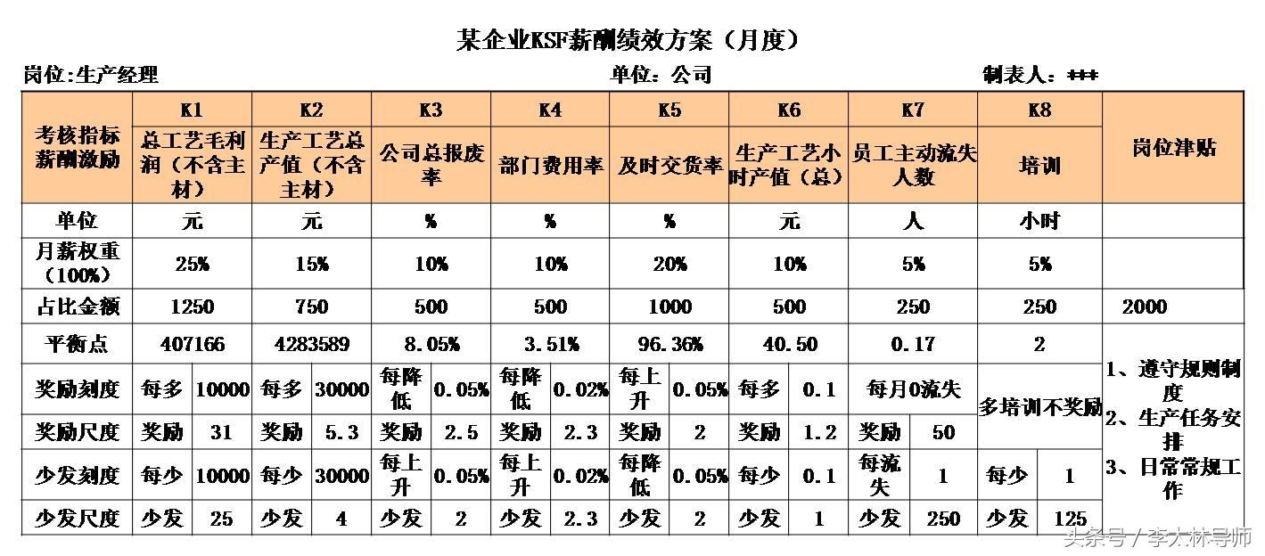 点评2:KPI强调以目标为导向、压力式考核,重考核、评价而轻激励、共赢,不符合新时代的发展趋势,在很多企业都无法达到更高的管理成效。建立采用KSF薪酬全绩效模式(后附案例)。