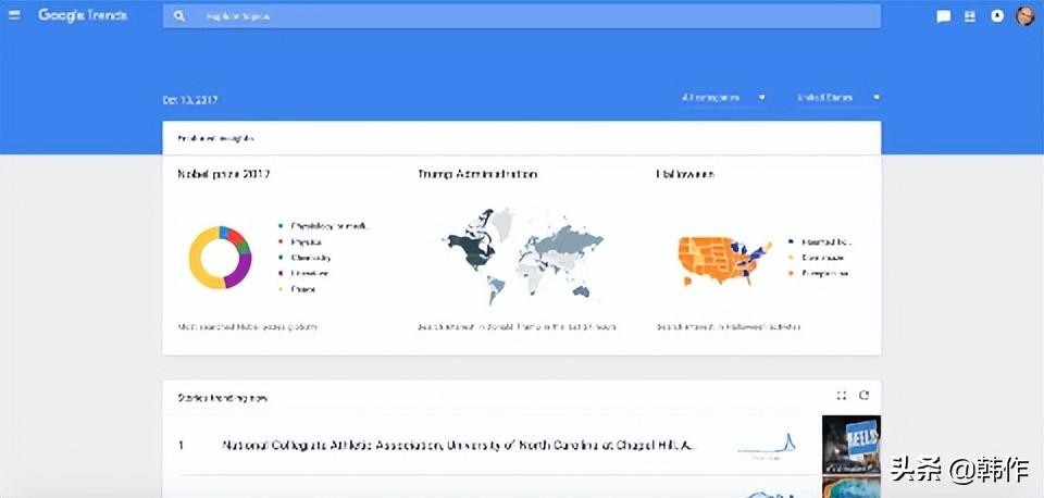 比较各种关键字的搜索量模式并按日期、类别和地区过滤结果以查看趋势数据。