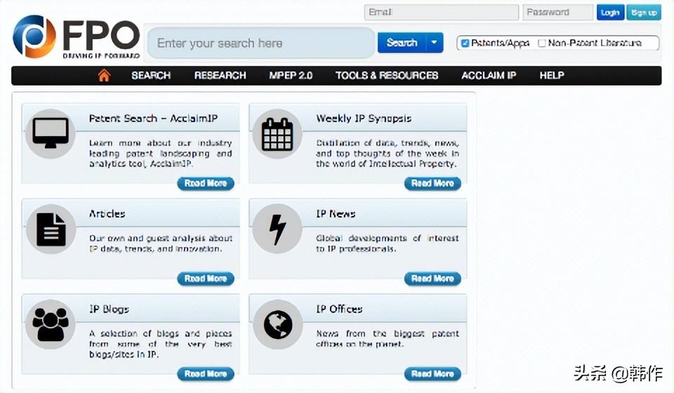 专利数据库,具有新闻、博客文章、可视化数据、专利地图等的高级搜索功能。FPO 还允许通过 PDF 格式下载专利申请和图表。