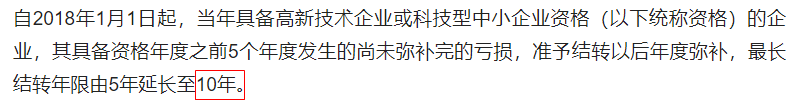 政策依据:《财政部 税务总局关于延长高新技术企业和科技型中小企业亏损结转年限的通知》 (财税〔2018〕76号)
