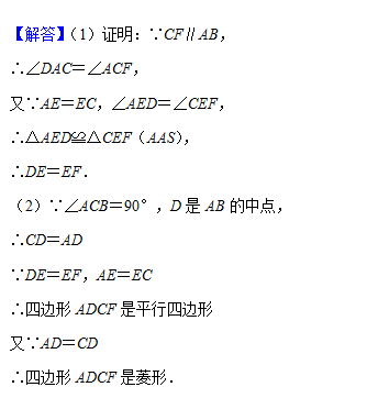 (2)由对角线互相平分的四边形是平行四边形可证四边形ADCF是平行四边形,再根据直角三角形斜边上的中线等于斜边的一半得到CD=AD,即可证四边形ADCF是菱形.