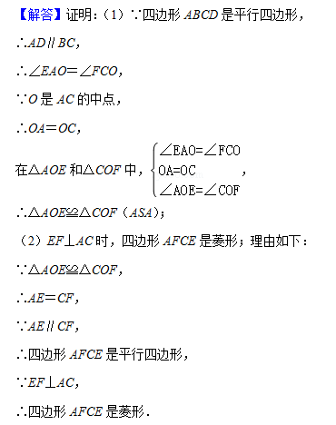 【分析】(1)由平行四边形的性质得出AD∥BC,得出∠EAO=∠FCO,由角边角即可证出。