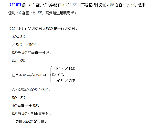 (2)由△AOE≌△COF,得出对应边相等AE=CF,证出四边形AFCE是平行四边形,再由对角线EF⊥AC,即可得出四边形AFCE是菱形.