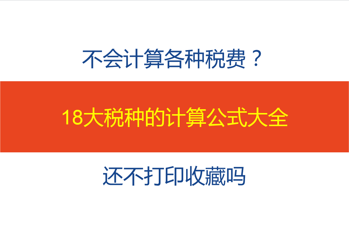 我们的会计工作除了做账,还有另外一项很重要的就是报税。因此,我们就要知道各种税的计算公式。记住各种税的计算公式,一方面这是我们最基本的工作要求了,另一方面掌握了这些公式之后也能提高我们的工作效率,避免别人一问自己啥都不会的尴尬局面。对老会计来说这些公式早已经是了然于胸了,但对很多新手会计来讲还是模模糊糊的,没有统一的去记忆、背诵和使用。