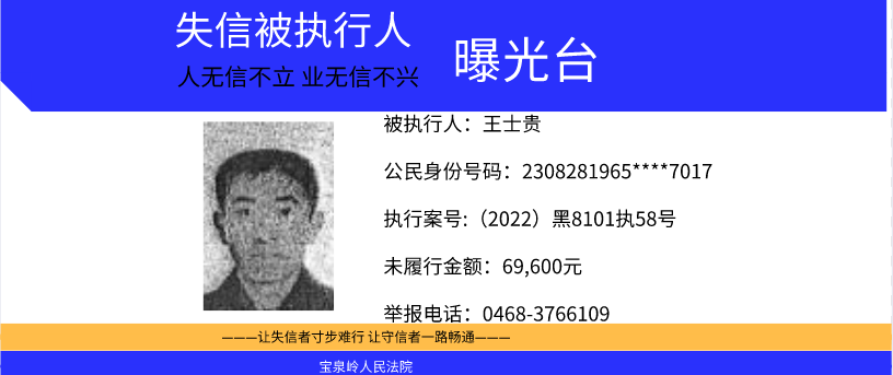 宝泉岭人民法院将持续向社会公布失信被执行人员名单,欢迎大家向宝泉岭人民法院提供失信被执行人员的行踪和财产线索,并对他们的高消费、转移或隐匿财产、规避执行等行为进行举报(举报电话:3766109)。