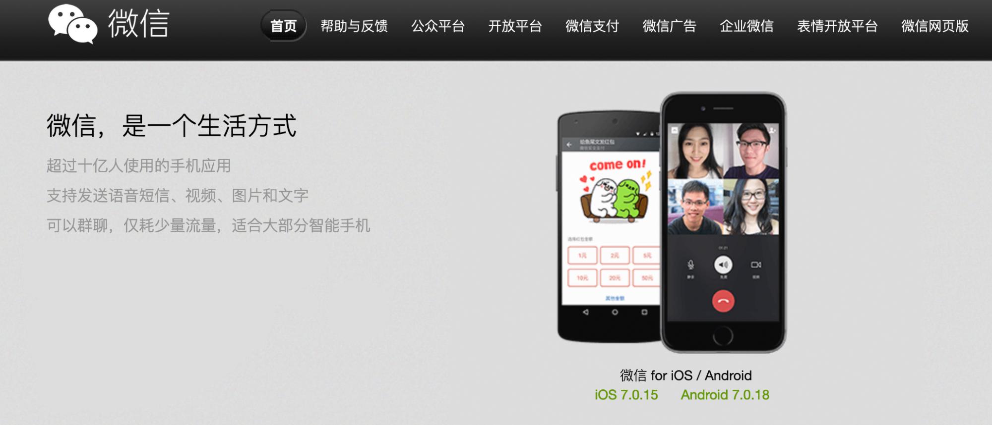 回到现在,微信是什么呢?我们每天打开手机微信,仅仅了解到的是微信的一个产品,微信APP,其实在微信的官网 weixin.qq.com 有明确的表达: