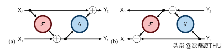 可逆神经网络将每一层分割成两部分,分别为 和 ,每一个可逆块的输入是 ,输出是 。其结构如下: