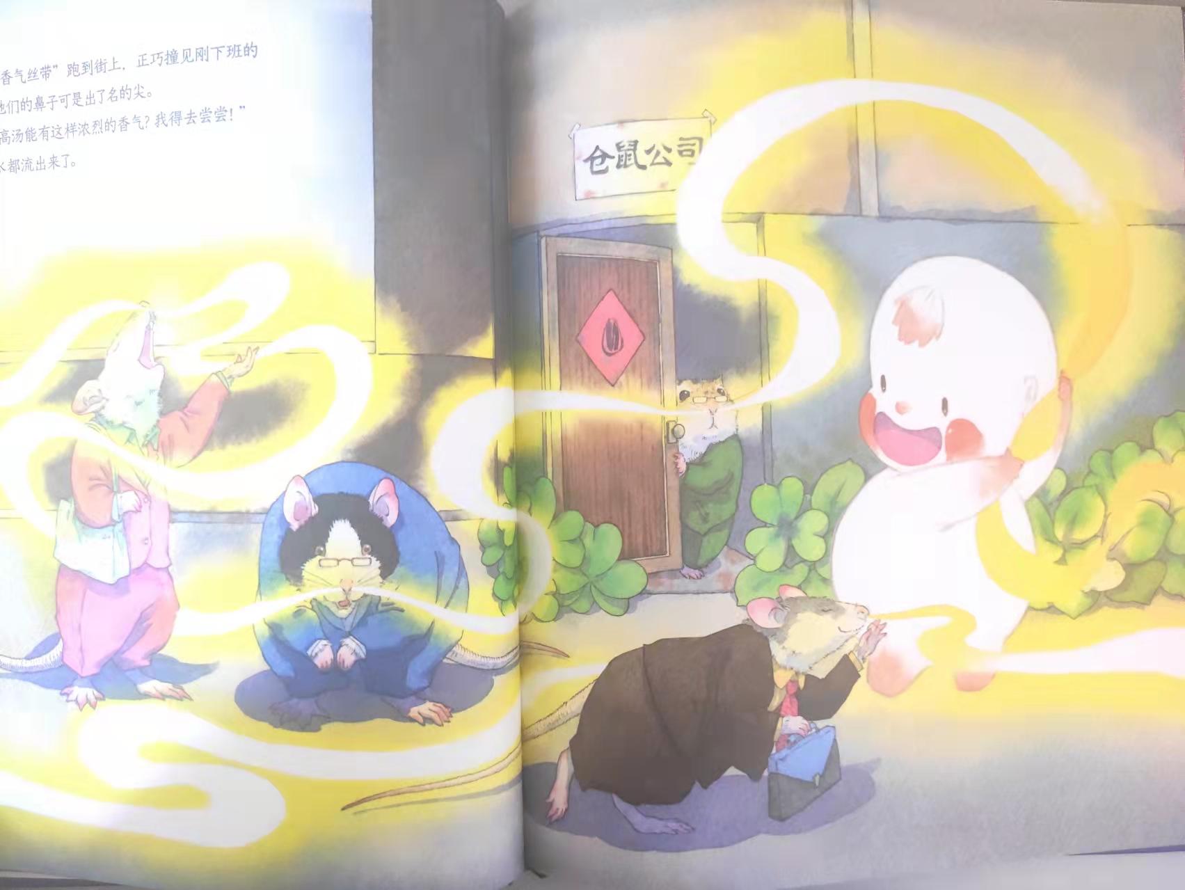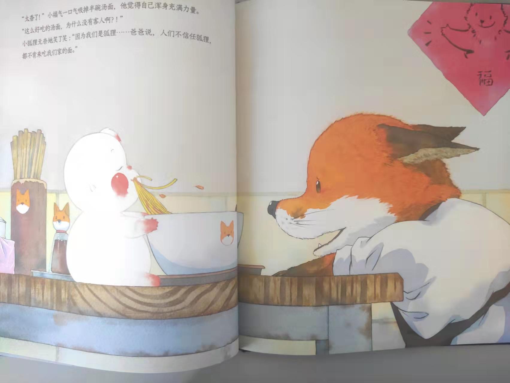 小狐狸发现了小福气,他看出小福气的疲惫,就主动给它端来了一碗面。这碗面真香啊,它让小福气变得元气满满。小福气想要报答小狐狸,于是用自己的法力,帮助小面馆传播面的香气。最后,整个街上,都是汤面的浓香。人们排着队,一起来到小狐狸的面馆,人们幸福的表情,让整本书洋溢着说不出的温情。