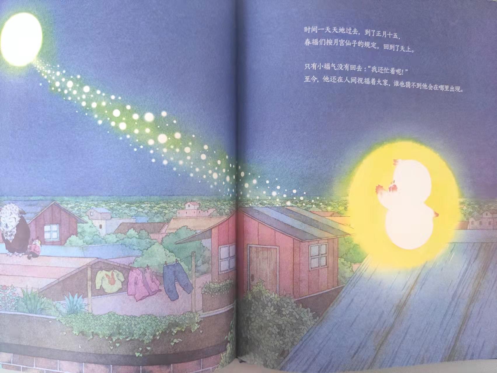 小狐狸贴心地为小福气布置小床,在安静的夜里,小福气发现自己已经成为了“春福”,它终于也可以点亮。小狐狸并不贪婪,他很满足,只希望小福气能去到更多的地方,给他人带来幸福。最后,小福气告别了小狐狸,他一直忙碌地播撒着祝福,对他来说,正是小狐狸的幸福,给了它不断成长的动力。