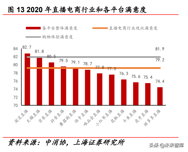 从用户使用占比上看,2020 年淘宝直播、抖音直播、快手直播使 用用户占比分列前三,占比分别为 68.5%、57.8%、41.0%;其中忠 实用户占比分别为 46.3%、21.1%、15.3%。从用户满意度上看,淘 宝、京东等传统电商深耕电商行业,满意度明显处于行业领先地 位;快手、抖音等新兴内容电商平台尚需进一步搭建电商生态, 满意度低于行业平均值。2020 年直播电商行业整体满意度为 79.2, 淘宝直播、天猫直播、京东直播满意度分别为 82.7、81.8、80.5; 抖音直播、快手直播满意度分别为 79.5、78.7。