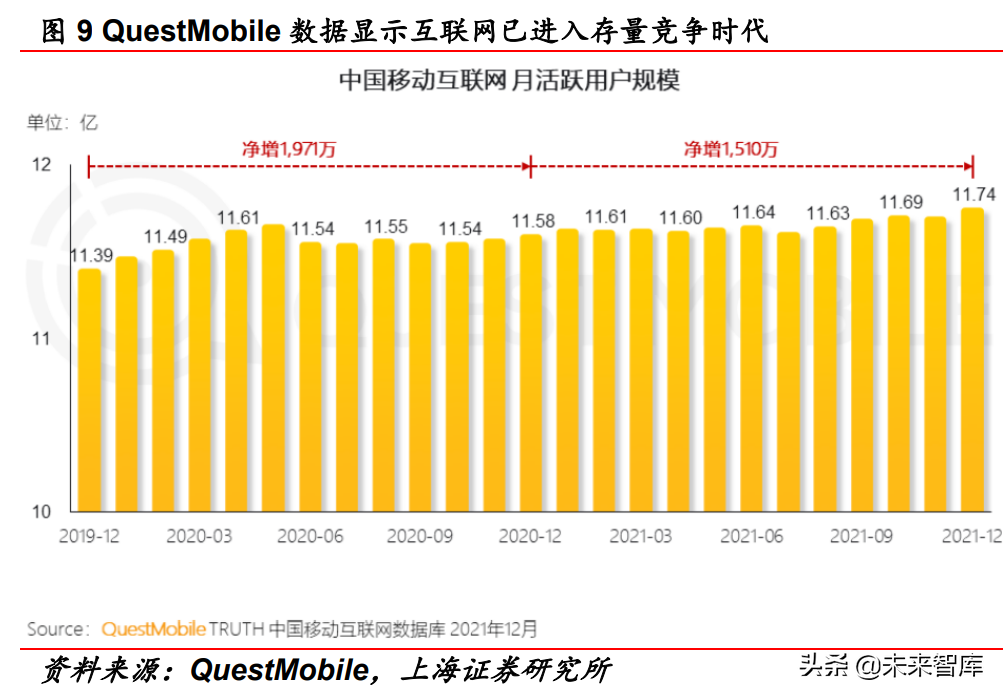 中国互联网历经 2000 年 PC 互联网、2010 年移动互联网已收获巨 大的发展红利,已进入存量竞争时代的下半场。建议关注优质互 联网媒体形态如短视频及新型商业模式如内容电商。根据 QuestMobile,2021 年 12 月中国移动互联网用户已达到 11.74 亿 人的高位水平,相对 2020 年 12 月微增 1510 万人。
