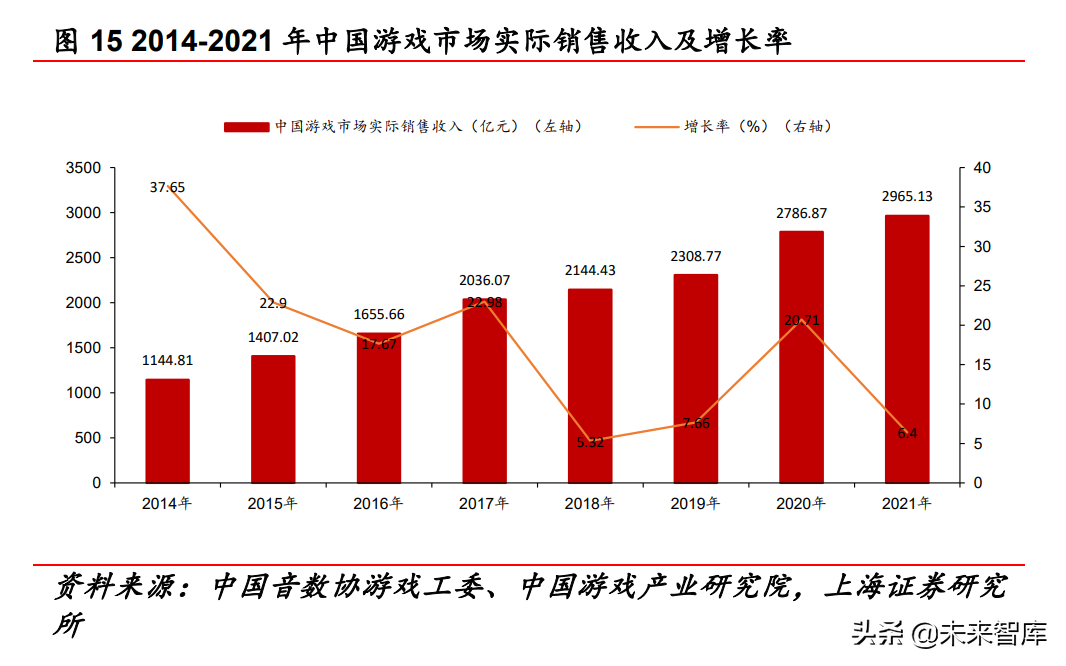 从行业基本面上看,游戏行业历经移动游戏用户增长红利、端游 IP 转手游 IP 红利,行业规模及用户规模增速逐步放缓。2021 年中国游戏市场实际销售收入 2965.13 亿元, 同比增长 6.40%,增速放缓至个位数。根据 Gamelook,受宅经济 的刺激效应减弱、头部游戏数量减少、游戏研发与买量成本增加 及游戏版号暂停影响,2021 年同比增速下降 14.31pct。