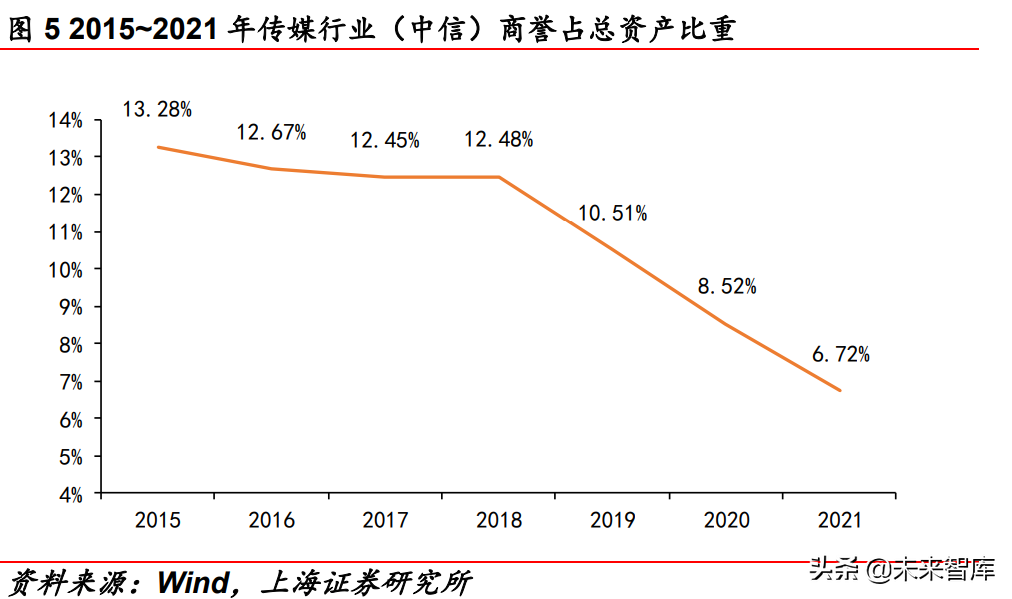 从板块商誉变化情况上看,传媒板块积累大量商誉减值风险,并 于 2019 年(业绩对赌普遍完成)集中释放,大幅拉低传媒公司报 表利润。纵向对比看,2015-2018 年传媒类公司商誉账面价值占总 资产的比例维持在 12.5%-13.5%的高位,2019 年-2021 年持续释 放商誉风险,商誉账面价值占总资产的比例逐年下降,分别为 10.51%、8.52%、6.72%。横向对比看,传媒(中信)商誉账面 价值总额占总资产的比例仍处于各一级行业板块前列,但差异值 明显下降,并由 2017 年的第一位降低到 2021 年的第二位。