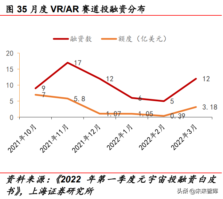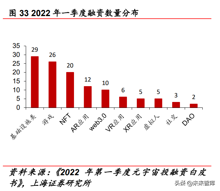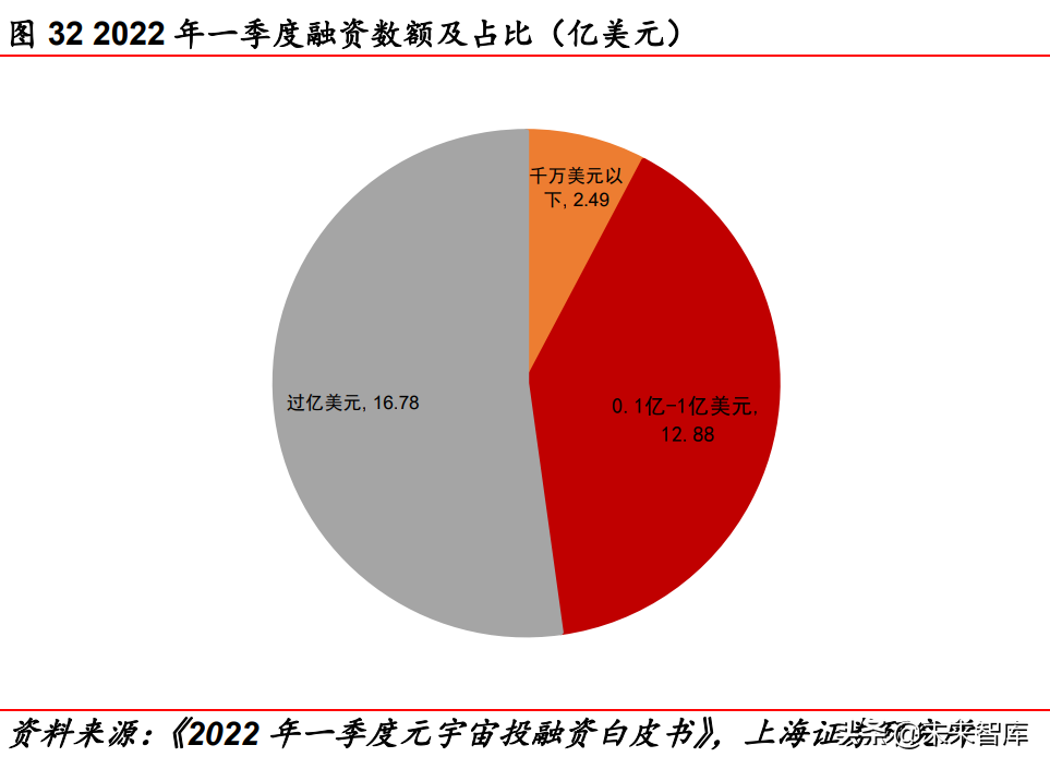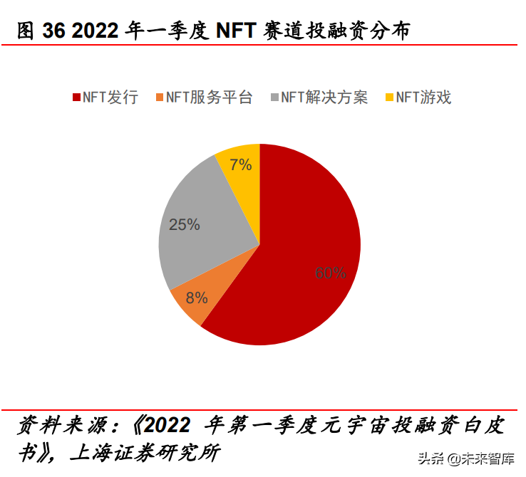 从投融资情况看,1Q22 元宇宙投融资规模明显增加。根据《2022 年一季度元宇宙投融资白皮书》,2020 年、2021 年元宇宙市场规 模分别仅 500 万美元、1700 万美元。1Q22 全球元宇宙共融资 122 起,融资总额约 32.15 亿美元,其中海外融资额接近 30 亿美元、 国内融资额约 3 亿美元。从融资规模上看,过亿美元项目共计 16.78 亿美元(共 7 起)、1000 万美元-1 亿美元项目共 12.88 亿美 元(共 45 起)、1000 万美元以下项目共 2.49 亿美元(共 70 起); 从融资项目数量及融资数额上看,基础设施类、游戏、NFT 均排 列在前三位;其中 NFT 融资分布可分为 NFT 发行、NFT 服务平台、 NFT 解决方案、NFT 游戏四类,融资占比分别为 60%、8%、25%、 7%。