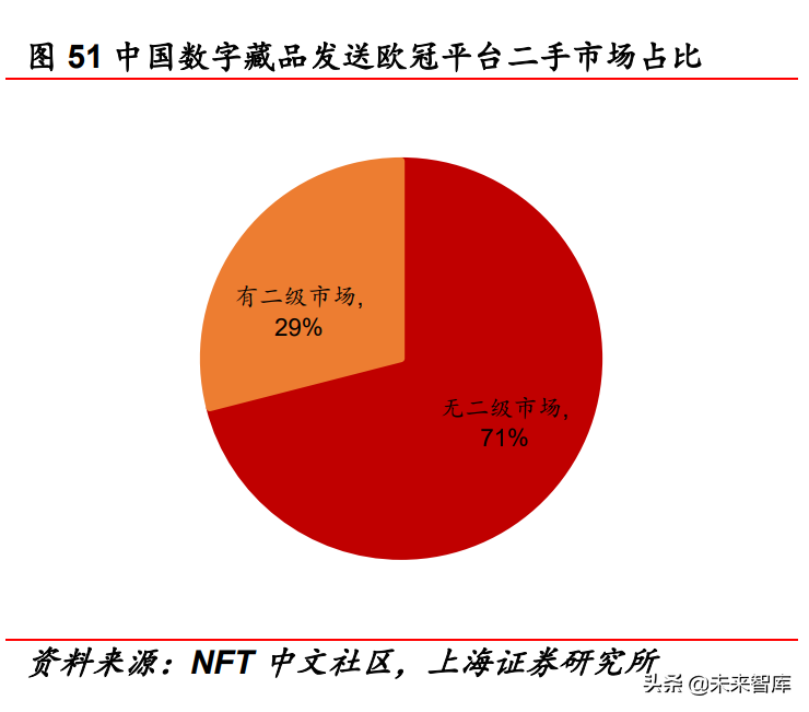 相比之下,国内NFT市场(尤其是数字藏品)整体上处于小众而火 热的市场格局。其本质差异来自国外已为创作者开放了二级交易 市场,使得NFT相关产品供应量非常充足,属于买方市场;国内 NFT市场基本采用PGC发布模式,供不应求,属于卖方市场。我 们认为国内对防范NFT金融监管的政策态度不会变化,未来二次 交易的形态将与国外有明显差异。根据NFT中文社区,2022年4月 我国共有114家数字藏品发售平台,其中二次交易市场大多通过转 赠功能实现,且转增功能较为严格,如国内用户数最多的鲸探转 赠规则为“数字藏品在购买满180天或受赠满2年后,可转赠给满 十四周岁的实名用户”。目前国内数字藏品发售平台中,具备及不 具备转赠功能的平台占比分别为48%、51%;有及没有二级市场 的平台占比分别为29%、71%。