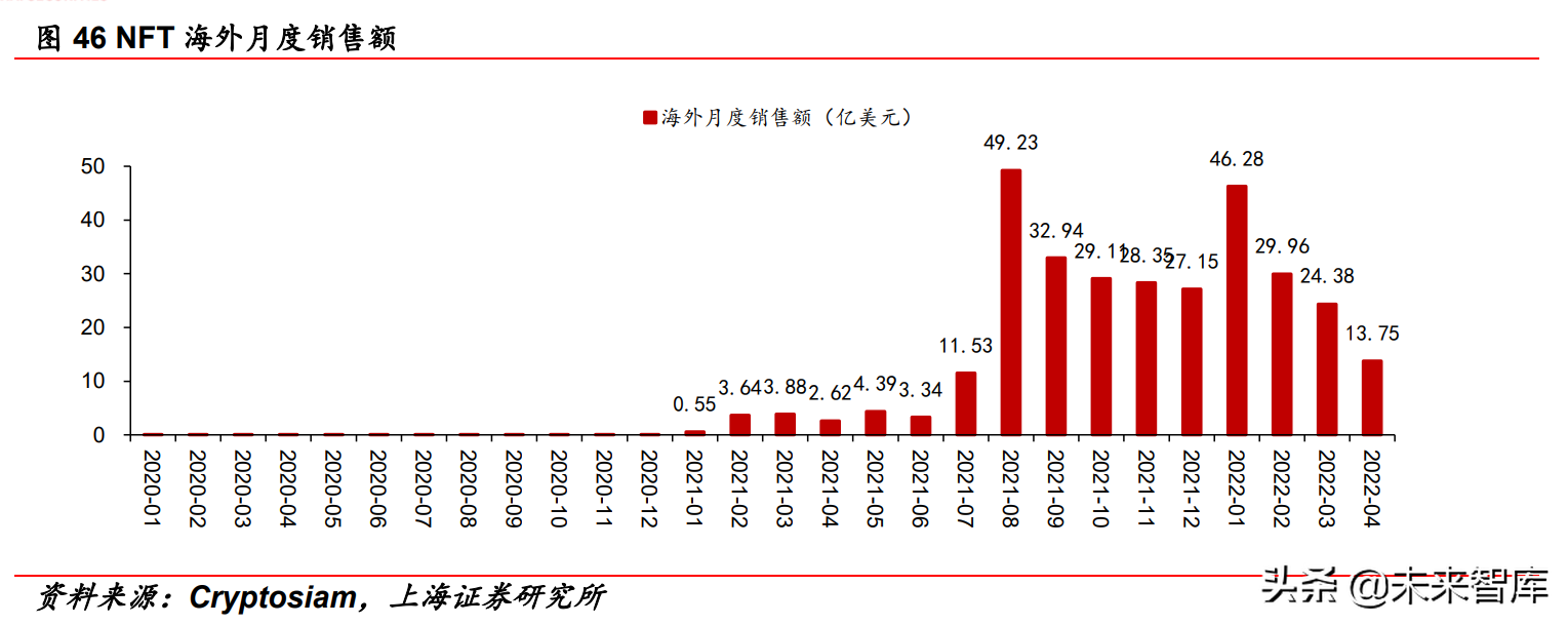 NFT市场与二次交易的开发程度高度相关,建议关注国内相关政策 的推进及二次交易开放进程的推进,关注方向现阶段主要为数字 藏品,未来可关注游戏道具的NFT化,因为相比数字藏品,游戏道 具具备较高的使用价值。目前数字藏品系NFT市场主要交易标的, 根据SMeta,2021年NFT数字藏品市场交易额超400亿美元,绝大 部分是图片等“艺术形式”的收藏品类NFT。国内各平台发售数字 藏品数量约456万个,总发行量市值约1.5亿元,平均售价约33.33 元。(报告来源:未来智库)