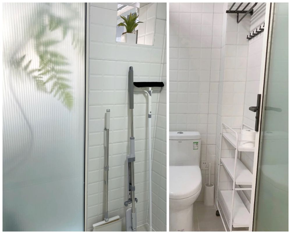 她不仅将马桶的位置稍微做了改变,同时还全面换了卫生间地面和墙面的瓷砖,再加上入户的长虹玻璃门,既考虑到了空间的布置,又考虑到了采光、通风等一系列问题,让小卫生间变得更加清洁明朗。