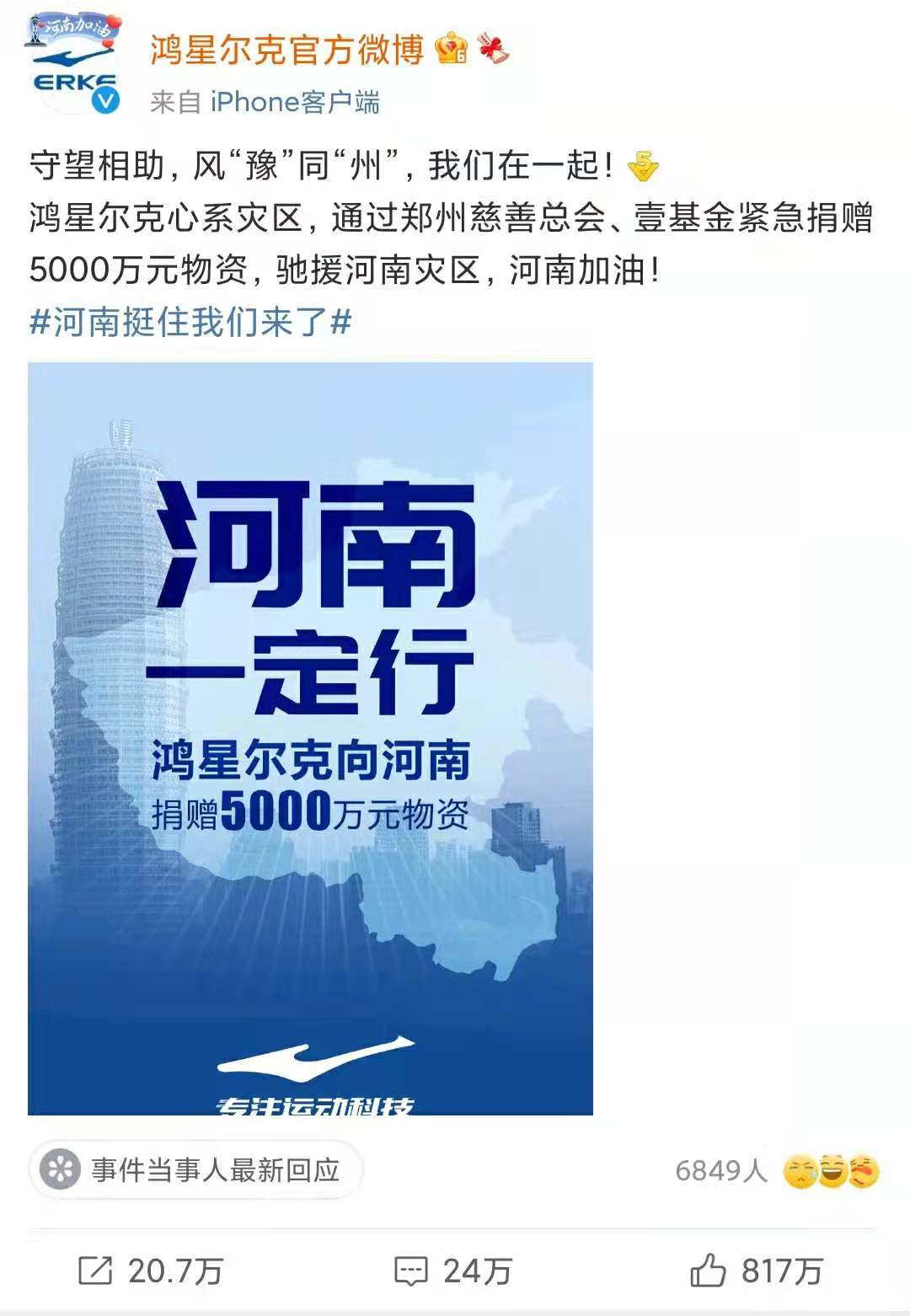 这无疑为鸿星尔克默默捐献行为提供了合理依据。不但完全消除了有意操作的嫌疑,更在此行为上涂抹上了令人感动的故事色彩,“鸿星尔克的老板自己淋过雨,所以这一次想要为别人撑把伞”。