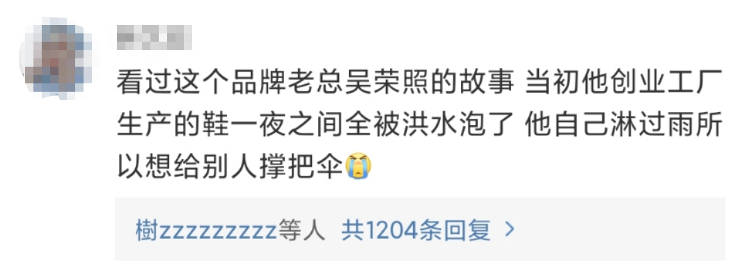 除了这种倾尽所有的气魄感染了网友,更重要的是在这种行为之下,网友挖出了品牌老总的创业故事:鸿星尔克创业时,也曾经历工厂鞋一夜之间被洪水浸泡。