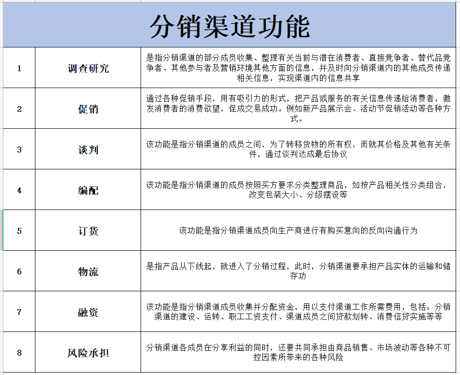 但同时也有其他方面的功能。分销渠道的功能主要有: