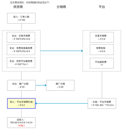 将供货订单金额结算给供货商;收取交易发手续费、平台服务费、有赞担保;替供货商给分销商支付推广佣金;给供货商一笔平台手续费补贴。例如:推广价格100,运费0,价格80,供货运费0,供货平台服务费1%,加入了有赞担保的供货商为例,一笔订单在交易完成时,供货商端的资金流如下: