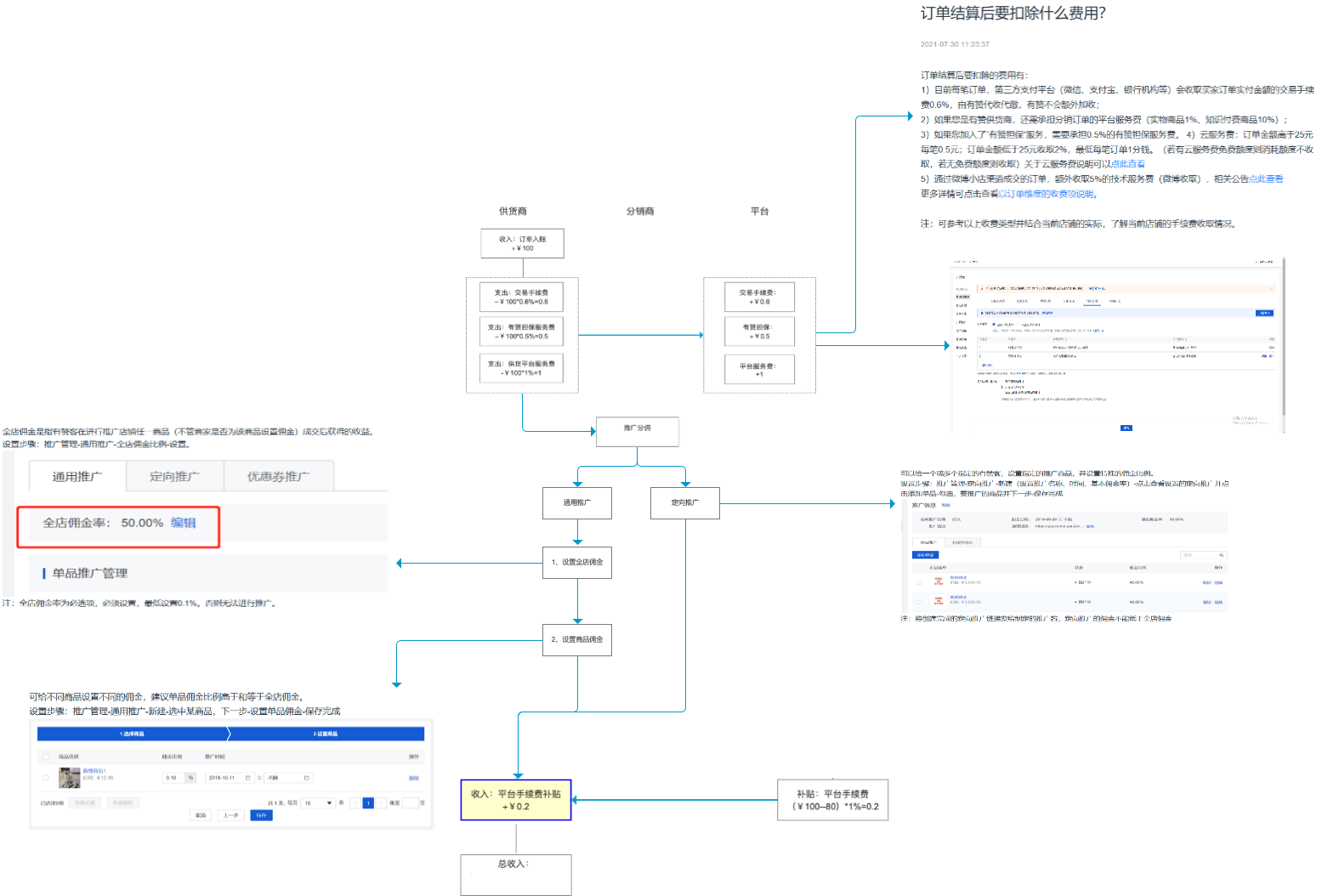 供货价:供货价原价,按照单个商品展示。供货商品优惠:供货商给分销商的优惠,例如等级折扣;按照单个商品展示。供货运费:供货商给分销商的运费结算价。推广佣金:分销商以推广者的身份帮助供货商卖货,交易完成后,由供货商结算给分销商的一笔佣金;按照订单展示。单个商品的推广佣金:推广商品佣金= 买家实付商品金额-供货结算金额,计算结果大于0时才计入补差金额;买家实付商品金额=推广价格-推广商品优惠,供货结算金额= 供货价-供货商优惠;订单级的推广佣金=所有商品的推广商品佣金之和+买家运费-供货商运费。3. 系统做出的操作如下