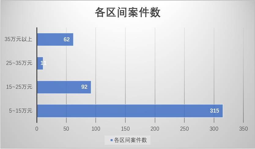 区间一的案件数量是最多的,达到315起,主要原因是这个区间的数额超过虚开增值税专用发票罪立案追诉标准数额不多,比较容易认定为“犯罪情节轻微”。区间二的案件数量排在第二位,共有92起;区间三的案件数量最少,只有11起;区间四的案件数量为62起,排在第三位。