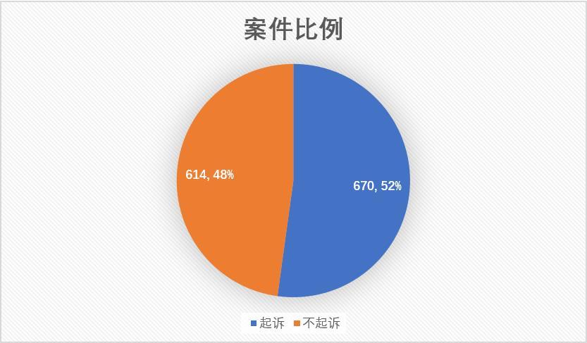 上图表是江苏省2019年6月1日至2020年5月31日期间,虚开增值税专用发票罪的案件比例情况,包括起诉书和不起诉决定书共计1284份,其中:起诉书670份,约占52%;不起诉决定书614份,约占48%。笔者通过OpenLaw网站搜索江苏省虚开增值税专用发票罪案件同期的法院判决、裁定的情况,共计有1014份裁判文书,其中:判决书686份;裁定书328份。按这个数据来看,起诉书的数量偏少,原因可能是检察机关未将全部的检察文书予以公开而导致的。