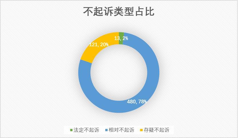 从上图表可以看出,在614份不起诉决定书当中,检察机关作出相对不起诉决定的案件占绝大多数,共计480份,约占78%;作出存疑不起诉决定的案件共有121份,约占20%;数量最少的是作出法定不起诉决定的案件,只有13份,约占2%。