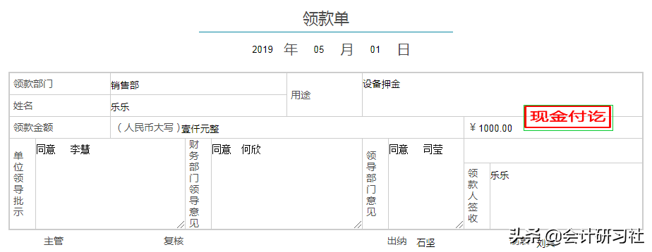 2019年05月01日,公司销售部业务员乐乐领取设备押金1000元,出纳石坚以现金支付。